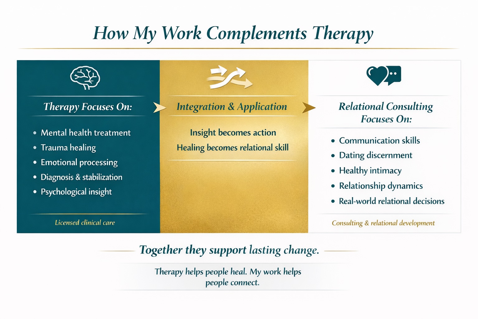 Many clients work with me alongside therapy or after therapeutic work to translate insight into real-world relational change.